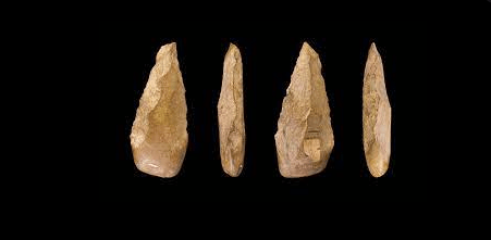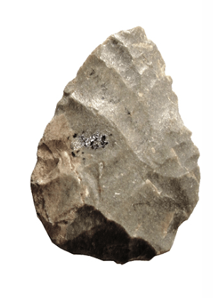 The ability to make tools was once thought to be one of the defining characteristics of humankind. More recent work has revealed that that tools are used by many other animals. We don't know what types of tool our ancestors might have been made from perishable materials, like wood but we do know that for a very long time the hand axe was the only stone tool that humans could conceive of. To the right is an example dated from around 500,000 yrs ago, recovered from a cave in Atapuerca in Spain.